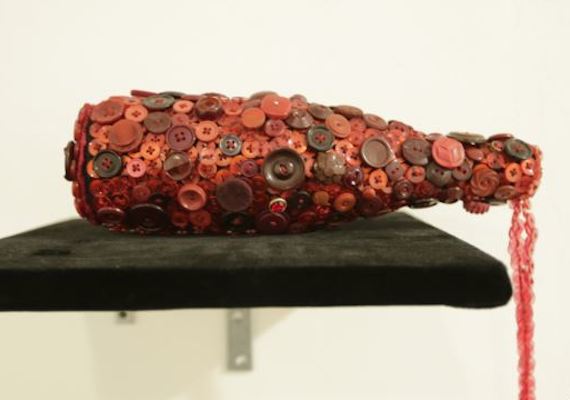 Peter "Souleo" Wright organized "The Button Show," at Rush Arts Gallery in the Chelsea neighborhood of Manhattan. Eleven artists used the small, ordinary objects to create sculptures, portraits and wearable art. Some of the works are political, some are personal and others are just fun. Wright said each artist reimagines and repurposes the buttons to make art. What I tried to do with this show, he said "was look at artists who were elevating that level of craft." He said he wanted the button art to be comparable to a painting because of the amount of detail and precision in the work.” Artist Beau McCall produced A Harlem Hangover. It looks like a wine bottle that fell over on a table. A stream of connected red buttons hang over the side, like wine flowing down. Similar red buttons form a small pool on the floor. McCall layers buttons of different shapes and sizes to create the bottle. The stitching that holds them together is also part of the artistic design.