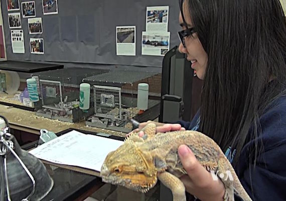 Talking birds, goats butting heads, and a giant tortoise that hangs out with chickens are all part of a living classroom. High-school students at the Career Center in Arlington, Virginia are learning firsthand, and hands-on, how to care for animals. They are at the animal science laboratory, learning about, and taking care of, about 50 species of animals. Holding a happy rabbit in her arms, Elleny Alemu says it is “so cute.” She says soon she will be getting one of her own. Miguel Zambrano doesn’t feel the same way about Snickers. That is a temperamental brown miniature horse. Zambrano is feeding her hay, hoping she will let him brush her. “She gets mad if you just sometimes don’t even pay attention to her. I do not want a horse. It’s going to be way too much work.” Zambrano is one of 70 students taking the yearlong animal science program. Students learn in class and hands-on with the animals. It gives them both class credit and a chance to learn what it is like to work with animals.