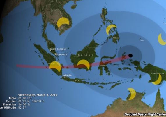 A solar eclipse will pass over Earth on Wednesday, starting in Southeast Asia March 9, and ending in the western Pacific on Tuesday evening, March 8. No, the Earth is not changing direction. An eclipse occurs when the moon moves between the sun and the Earth. When it is lined up between the sun and the Earth, it creates a shadow and darkness on Earth. Before science explained the phenomenon of a solar eclipse, days when the sun went dark were thought to be bad omens. The website TimeandDate.com says ancient cultures believed the sun disappearing during the day was a sign that gods were fighting or animals were taking bites out of the sun. During the March 8 and 9 eclipse, the shadow will cross the International Date Line. The date line runs from the North Pole to the South Pole, along the Pacific Ocean.