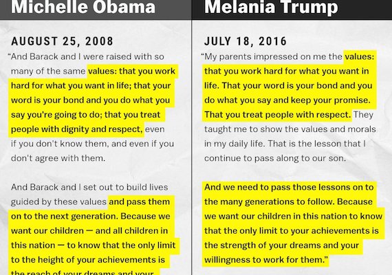 Melania Trump is the wife of presumptive Republican presidential nominee Donald Trump. On Monday night, she gave a speech at the Republican National Convention in Cleveland, Ohio. It is a tradition for the partner of party nominees to speak at the convention. Her 14-minute speech earned loud cheers. She talked about her experience as a Slovenian immigrant in America, and praised her husband, calling him “intensely loyal.” Donald Trump wrote on Twitter Monday night, “It was truly an honor to introduce my wife, Melania. Her speech and demeanor were absolutely incredible. Very proud!” But, not long after Melania Trump’s speech ended, an unemployed journalist named Jarrett Hill noticed similarities between her speech and the one given by Michelle Obama at the 2008 Democratic National Convention. Her husband, Barack Obama, officially became the Democratic presidential nominee at that convention. Hill wrote on Twitter: “Melania stole a whole graph from Michelle's speech”