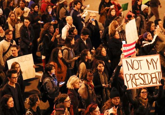 Groups of Americans protested Donald Trump’s election on Wednesday night and into Thursday. The events were both peaceful and violent. They happened in many places around the country, from New York to California. More demonstrations were planned for Thursday and into the coming weekend. People filled Midtown Manhattan in New York City Wednesday night. Videos and photos showed a huge crowd marching past Rockefeller Center. People also gathered in front of a building with Trump’s name on it in New York City, as well as around a new Trump hotel in Washington, DC. The hotel in Washington is a short distance from the White House. Protesters held signs that read “Love TrumpsHate.” Many of the Americans who gathered this week were protesting against the views Trump expressed about women, minorities and immigrants during the presidential campaign.