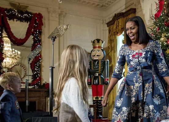 President Barack Obama and his family will celebrate their eighth and final Christmas in the White House next month. On Tuesday, White House staff and first lady Michelle Obama revealed this year’s holiday decorations. They include nearly 70,000 ornaments, 63 Christmas trees, 56 gingerbread houses, and two very large statues of the Obama family’s dogs, Sunny and Bo. An estimated 68,000 people will visit the White House during the holiday season. There is no cost to enter. But, the very first people to see this year’s decorations were military members and their families. Michelle Obama welcomed them to the White House Tuesday. The first lady said the gold ornaments on the official White House Christmas tree honor military heroes.
