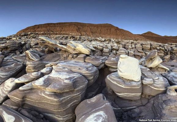 Welcome to the Petrified Forest National Park! The word “forest” may mislead visitors. The park is in a desert. And the word “petrified” -- which can mean “afraid”-- may scare visitors away! But fear not. “Petrified Forest” gets its name from the trees that have, over millions of years, turned to stone. That natural process is called fossilization. Much of the Petrified Forest formed from tall trees called conifers. They grew over 200 million years ago near waterways. During floods, water forced the trees to be pulled up from the ground. Over time, the wood from the trees became petrified. The Petrified Forest National Park is one of the wonders of Arizona. It sits within the Painted Desert. A Spanish explorer in the 1500s gave the place its name. It is easy to see why. The desert looks like an artist’s canvas. Brilliantly colored mudstones and clays cover the land as far as the eye can see. They contain bentonite, a clay that is the product of changed volcanic ash. The oldest geological formations in the park are about 227 million years old. Differently colored formations show different time periods. The Blue Mesa formations, for example, have thick bands of grey, purple, blue and green mudstones. They are about 220 million years old.