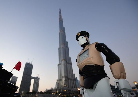 If you are in Dubai you may notice a robot police officer sharing the street with you. Your first thought might be, "Have I walked into a movie set?" The answer is no. That robot is Dubai's newest police officer. The robot has a touch screen instead of a weapon. The robot will be employed mostly at shopping centers and other places popular with visitors. The robot's face has eyes but no mouth or nose. It stands 165 centimeters tall and weighs 100 kilograms. If the robot works well, Dubai says 25 percent of its police force could be robotic by 2030.