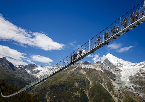 Switzerland has opened the world's longest suspension footbridge. It is 494 meters long. The bridge is suspended between 1,600 meters and 2,200 meters above sea level. It is only 65 centimeters wide and goes as high as 85 meters above the ground. Hikers, within sight of the famed mountain, the Matterhorn, and the Bernese Alps, can cross it in about 10 minutes. The bridge crosses the deepest-cut valley in Switzerland. Hikers can look down onto it through grates in the bridge. Without the bridge, the journey previously took up to four hours. According to Swiss reports, it took only 10 weeks to build the bridge.