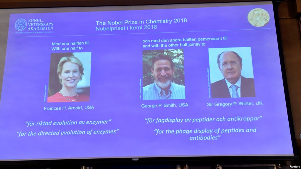 Two Americans and one Briton have won the 2018 Nobel Prize for Chemistry for developing new processes used to create drugs, chemicals and biofuels. Frances Arnold of the California Institute of Technology will receive half the prize, worth about $1 million. The other half will be shared by George Smith of the University of Missouri and Gregory Winter of the MRC Molecular Biology Laboratory in Cambridge, England. The Swedish Royal Academy of Sciences said Arnold used the processes of natural selection to create enzymes. Enzymes are complex proteins that make many chemical reactions possible. The academy described the process as being similar to biological evolution. It said the Nobel winners applied “the power of evolution and used the same principles, genetic change and selection, to develop proteins that solve mankind’s chemical problems.”