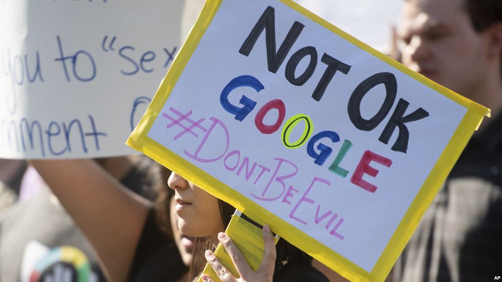 Many Google employees protested Thursday against the way the company deals with sexual wrongdoing, unequal pay and discrimination. Employees walked off the job for a short period at Google offices in Asia, Europe and North America. The hashtag #Googlewalkout trended worldwide on Twitter. Workers and protesters published images of the demonstrations in over 20 cities. Hundreds of employees protested outside of Google’s office in New York City. They carried signs with messages like “Not OK Google,” “Respect for Women” and “Don’t Be Evil,” which used to be Google’s motto. More than a thousand workers reportedly gathered outside of Google’s Mountain View, California, headquarters. In Dublin, Ireland, organizers and protesters showed support for victims of sexual harassment at work. Google employs 7,000 people in the city.