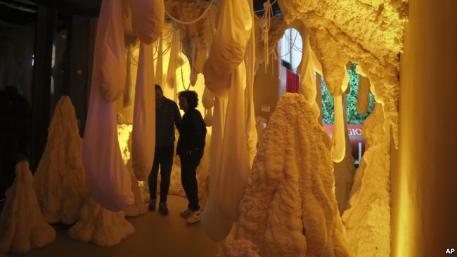 “Who loves pizza?” is a question you almost never have to ask an American. A better question might be “Who doesn’t love pizza?” Now, there is a place for all pizza lovers to gather: the newly-opened Museum of Pizza. It can be found in America’s pizza capital: New York City. A company called Nameless Network came up with the idea for the museum, known as “MoPi” for short. “It’s often that the simplest ideas are the best,” said Alexandra Serio. She is with Nameless Network. The company used the popularity of pizza as a way to get people “looking at art and hearing about history in a different format,” Serio explained. She added that Nameless Network asked many kinds of artists to create art works about pizza. They, in turn, provided large photographs, sculptures and huge installations. The Museum of Pizza is set up in a large space on the street level of the William Vale Hotel in Brooklyn, New York.