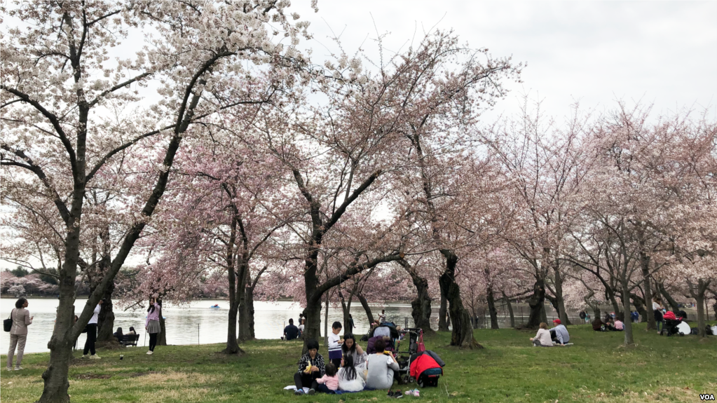 Washington, D.C.’s, cherry blossom trees are in full bloom. The United States National Park Service declared that the blossoms reached peak bloom on Monday. That means 70 percent of the Yoshino Cherry trees around the city’s Tidal Basin are flowering. Depending on weather conditions, peak bloom can last between just a few days or seven to 10 days. After what seemed like a long winter, mild weather returned to the DC area last weekend. On Saturday, the official daytime temperature reached 79 degrees Fahrenheit or 26 degrees Celsius. Many Washingtonians spent the day outdoors. They and thousands of out-of-town visitors walked among the cherry trees. For a time, Washington did not feel like a busy capital city. The famous lack of political harmony was nowhere to be found. People smiled, laughed and pointed up at the tiny blossoms. Many lifted cell phones high in the air and took pictures. Families spread blankets on the grass and enjoyed picnics. Under a sunny sky, boaters drifted along the Potomac River. One could hear people speaking in different languages, including Japanese, Chinese, German and Spanish.