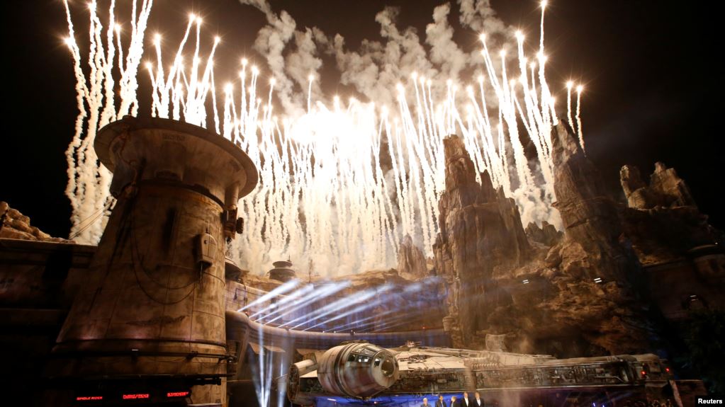 Chewbacca climbed into the pilot seat of the Millennium Falcon as fireworks exploded above Disneyland in Anaheim, California, Wednesday. Chewbacca is an imaginary creature born in the first of the Star Wars series of movies. He was in Disneyland for a ceremony to open the new Star Wars area at the theme park. “Chewie, let’s fire up the Falcon,” said Mark Hamill, the actor who played Luke Skywalker. He also attended the event to open the more than five-and-one-half hectare area called Star Wars: Galaxy’s Edge. It opened to the public Friday. The furry Chewbacca had trouble starting the huge spaceship, which led actor Harrison Ford to surprise the crowd and offer an assist. Ford played the Star Wars character Han Solo, a pilot. He hit the side of the ship and said “Peter, this one’s for you,” in honor of Peter Mayhew, the actor who played Chewbacca in five films and died in April.