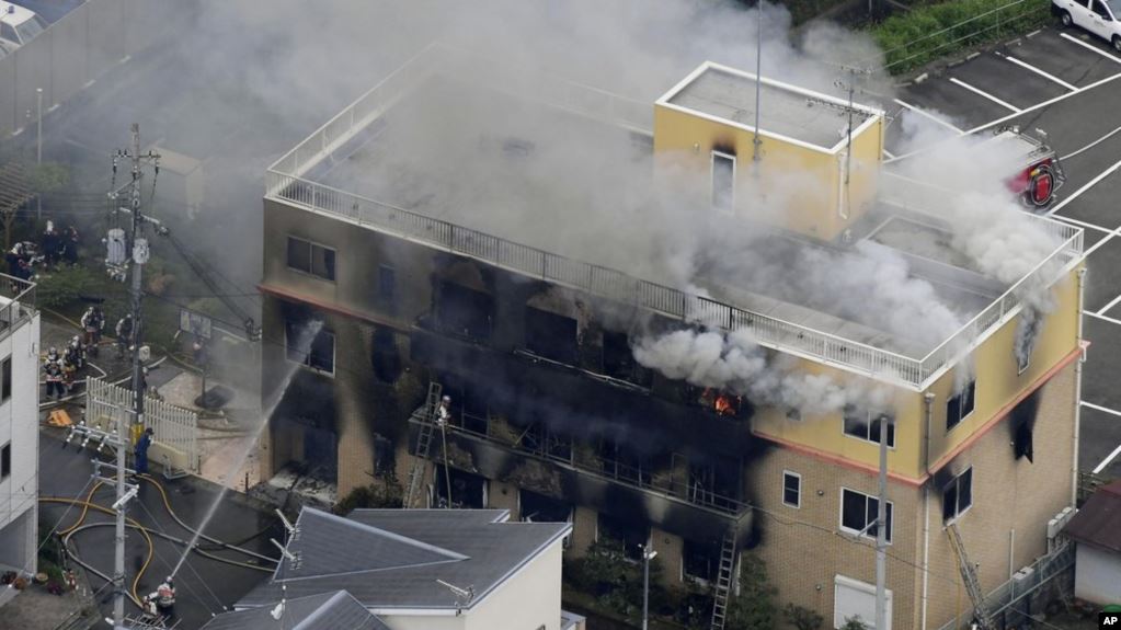 A man saying loudly “You die!” ran into a building in Kyoto, Japan, Thursday. He poured out a liquid and set a fire that killed more than 30 people. The attack, at an animation office building, shocked anime fans in Japan and beyond. Over 30 others were injured, some of them badly. Witnesses said they heard bangs coming from the building and saw people coming out blackened, bleeding and barefoot, Kyodo News reported. “There was an explosion, then I heard people shouting, some asking for help,” a witness told TBS TV. “Black smoke was rising from windows on upper floors.” Fire officials said more than 70 people were in the building at the time. Prime Minister Shinzo Abe commented on Twitter: “Today, many people were killed and wounded in an arson murder case in Kyoto. It is too appalling for words.”