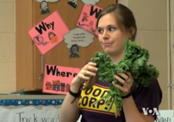 FoodCorps was launched five years ago. It sends more than 180 young Americans to 500 schools across the United States. The young people teach students about nutrition and how they can eat healthy foods both at school and at home.