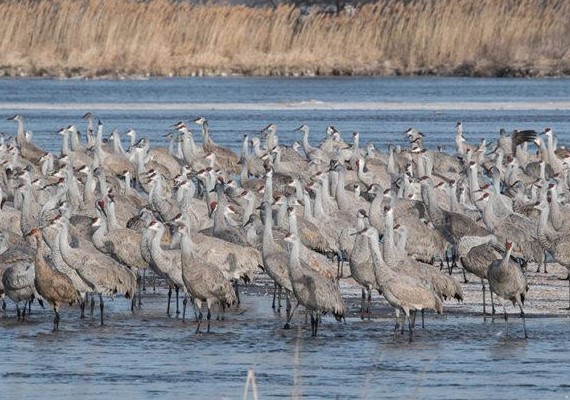 Every year in the month of March, one of the world's greatest wildlife migrations stops in central Nebraska. For a short time, sandhill cranes fill the state’s wide, flat fields. The land provides these long-legged, playful birds with the perfect place to rest and eat. Last year, a record 1 million sandhill cranes stopped in the area during their northward migration. That is about 85 percent of the world’s sandhill crane population. In recent years, more and more people have discovered the migration. Visitors crowd into river blinds, special structures that help keep the birdwatchers hidden. They look through their cameras or binoculars in wonder. Only one other migration on Earth is as concentrated and wondrous, local scientists say. That is the wildebeest migration in Africa.