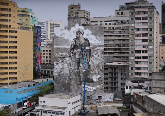 Brazilian artist Mundano has used the remains of burned trees from the Amazon rainforest to create a huge painting in Sao Paulo. The mural painting on the side of a building shows a firefighter standing among fallen trees, fires and dead animals. I'm using evidence of the crime, said Mundano. He calls the 1,000-square-metre artwork an act of "artivism". The word artivism suggests a link between art and activism. Mundano travelled more than 10,000 kilometers across Brazil during June and July. He collected the remains of burned trees and plants from the Amazon rainforest, the Pantanal wetland area, the Cerrado tropical savannah and the Atlantic Forest. He also met with firefighters and volunteers to listen to their stories. Brazilian President Jair Bolsonaro has struggled to keep a promise to end illegal forest clearing in the Amazon area. It is the world's largest rainforest. His calls for more farming and mining have, in some cases, led to increases in illegal forest clearing. In August, satellites images recorded 28,060 fires in the Brazilian Amazon area. Scientists say the Amazon plays an important part in easing the effects of climate change. Its plant life takes large amounts of carbon dioxide from the air and stores it. This mural is a protest, a cry for help, said Mundano. I support fire brigades and also for this fire culture to stop, it's leading us to self-destruction.