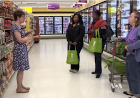 Nutrition educator Lindsey Seegers is leading this tour at a store in Silver Spring, Maryland. She says people should make meal plans before they go to a store because it helps them eat healthier meals. She warns that if no plans are made, you might buy something that is not as healthy.