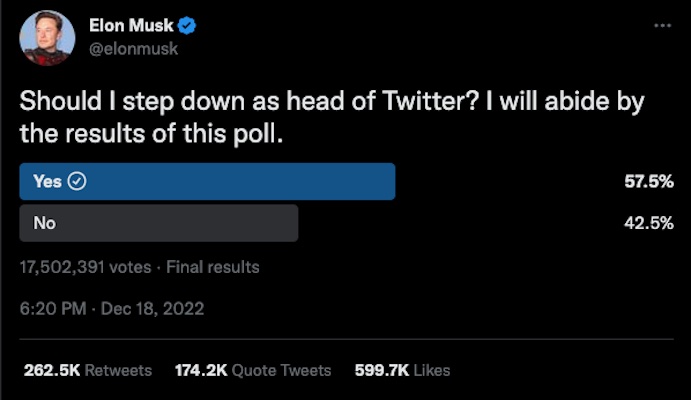 On Sunday, Elon Musk posted a poll on Twitter asking users if he should step down as chief of the social media company. The billionaire businessman bought Twitter in October for $44 billion. Musk wrote: “Should I step down as head of Twitter? I will abide by the results of this poll.” To abide means to accept. The poll closed on Monday and the results were in. Out of more than 17 million voters, 57.5 percent said “yes.” Musk has not yet commented on the results.