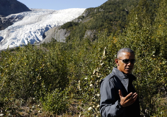 President Barack Obama walked on a melting Arctic glacier, a river of ice, in Alaska Tuesday. The president is on a three-day visit to the state. The American leader is urging nations to act quickly to cut the release of gasses linked to climate change. The president called climate change the defining threat of this century. He said the world is “not acting fast enough.”.