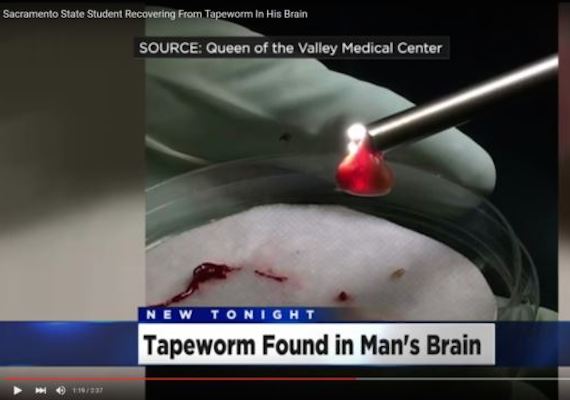 A California man who was feeling sick almost died recently from a shocking cause. 26-year-old Luis Ortiz went to a hospital because of a headache and nausea. When doctors examined him, they were shocked to find a tapeworm larva in his brain. The story gets stranger. The larva was still alive.